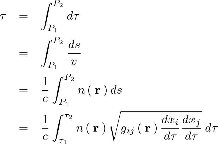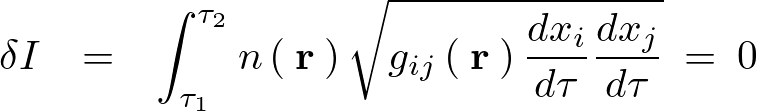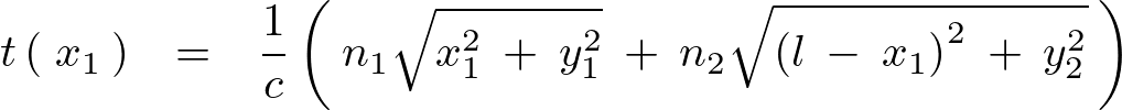 フェルマーの原理というのは媒質中(屈折率は一定とします)を通る光の2点間の通過時間は極小になるような経路をとるというものであり、幾何光学においては基礎的な理論になります。ここではこれに関して変分法を使って表してみましょう。