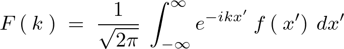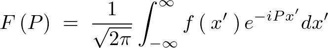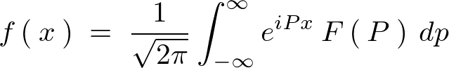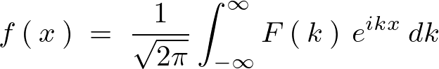 出てきた式を見てわかるように上記式変形中において出てきた下部鍵括弧のなかのものは最初に示したフーリエ変換式です。そして右辺の一番最後に出てきた式をフーリエ逆変換の式といいます。