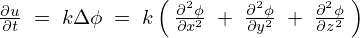 - 拡散方程式(熱伝導方程式) 変数として時間変数を用いて与えられている領域内において時間とともに変化する物体の場を記述し以下の式で与えられる