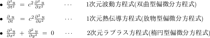- 波動方程式 変数として時間変数tを含み、音や光などの波動を扱い次の方程式によって与えられる