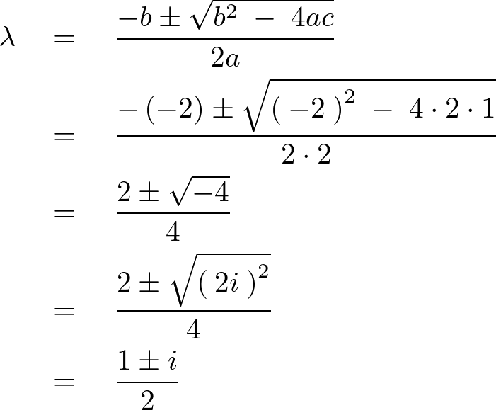 このとき解は実数と、それ以外に虚数と呼ばれるものがミックスされた複素共役と呼ばれるものになります。